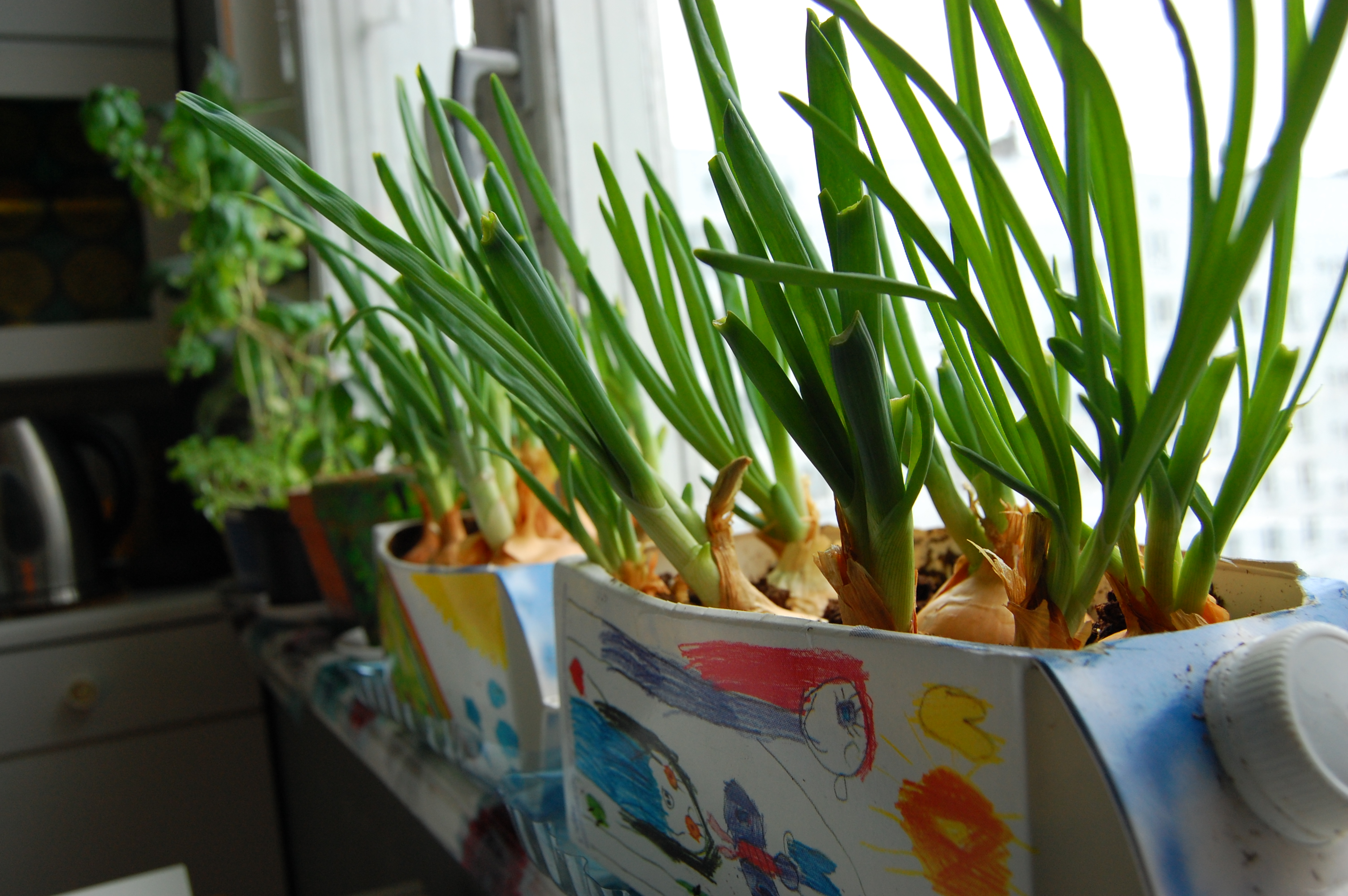 Kādreiz bija ierasts likt sīpla galviņu ūdenī, lai dzen saknītes un lociņus, taču es stādu sīpolus zemē, gan smaciņa nav no veca sīpolūdens, gan ilgāk var ražu vākt. Pagājušajā pavasarī saldējumu kastes labi noderēja, bet šajā pavasarī 2-litru ietilpības piena pakas – smuki var daudz sīpolus sarūmēt, jo piena pakas malas mazliet padodas.