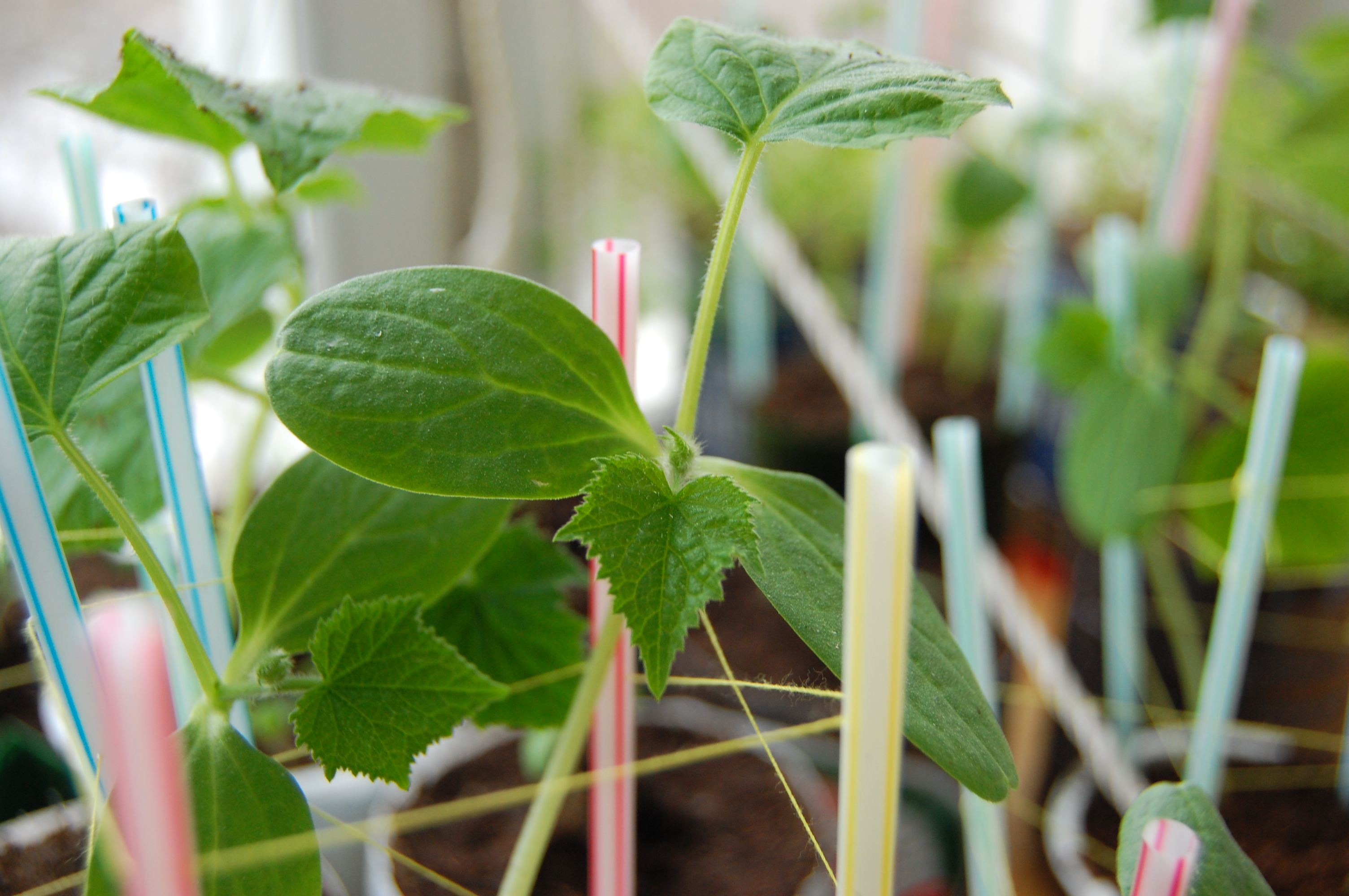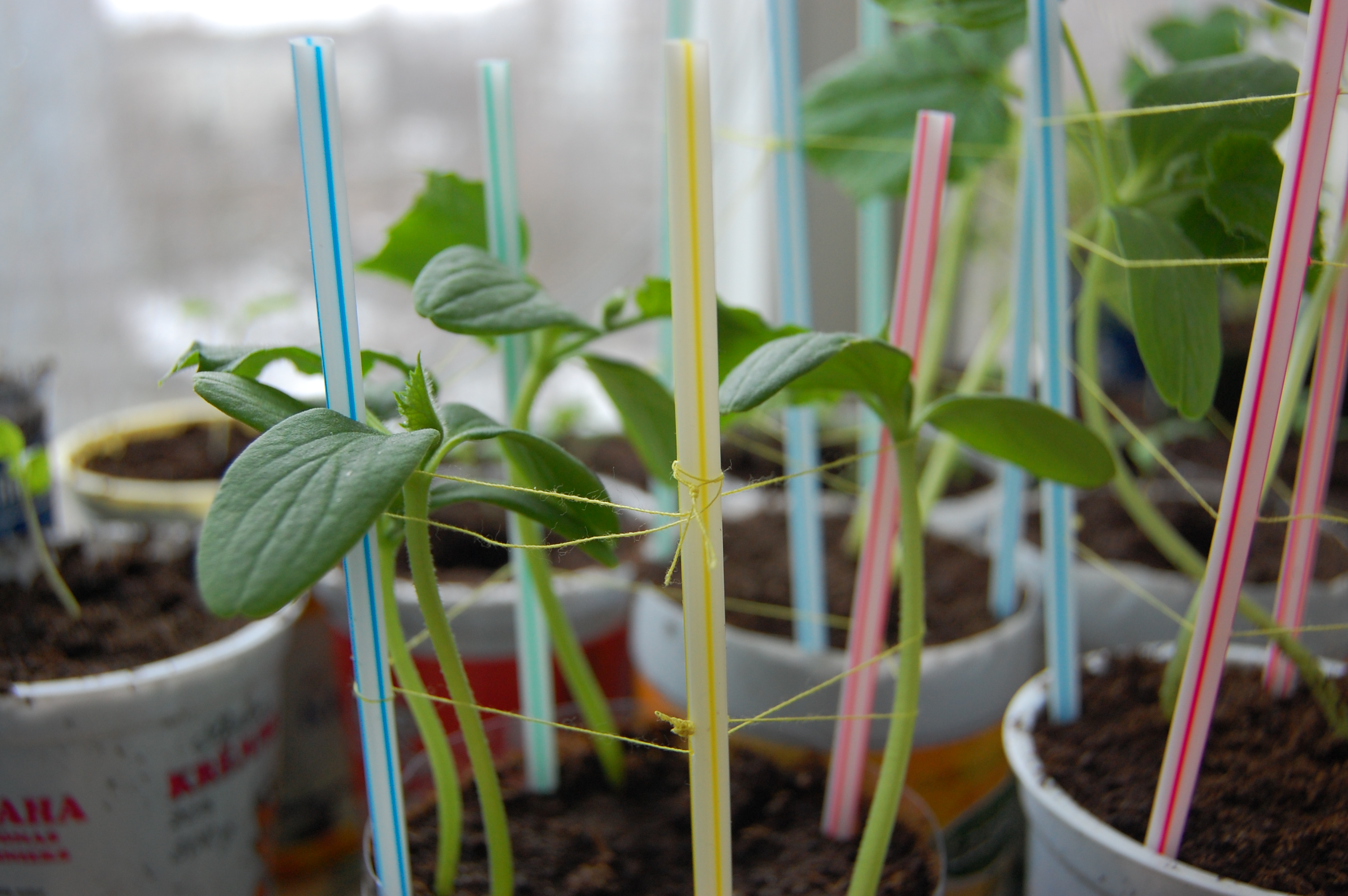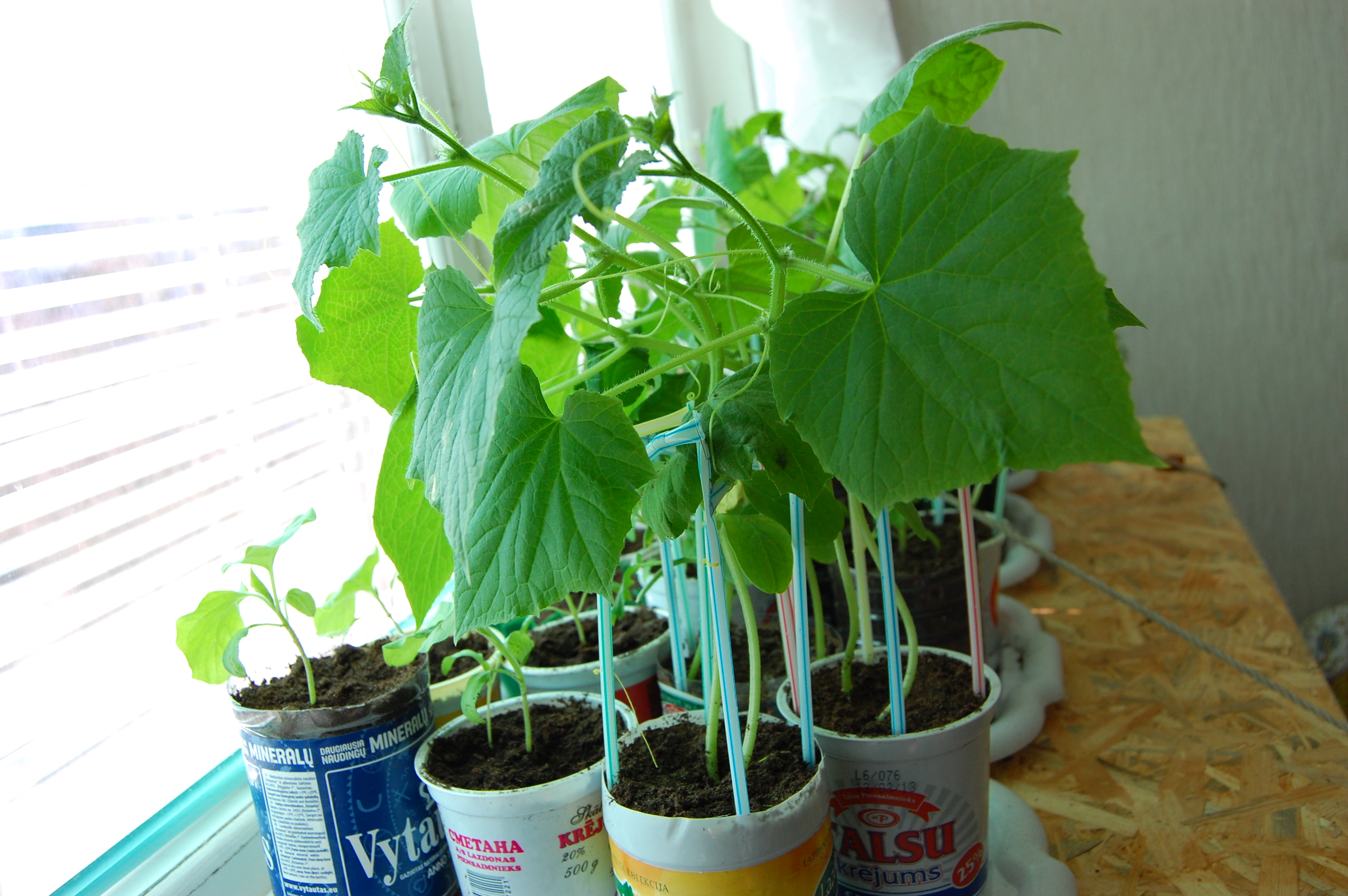 Uzmanīgs vērotājs pamanīs manas kokteiļsalmiņu konstrukcija gurķu atbalstam – sākumā četri salmiņi savienoti ar diegu, tad tie paši salmiņi aukšgalā savienoti ar salmiņiem un visbeidzot vēl viens stāvs pievienots tam pirmajam. Salmiņi tika savienoti vienkārši ar skavotāju, ruji, bet efektīvi. Pēc tam gan bija mazliet jāpiesien tie gurķi, jo salmiņi gurķu kātu svaru vairs neizturēja un gurķi sāka līst kur tiem pašiem patika – vislabāk patika aizkaros, kuri šobrīd ir sastumti malā, lai gurķi nepieauž tos ar ķerstīgajām stīgām.