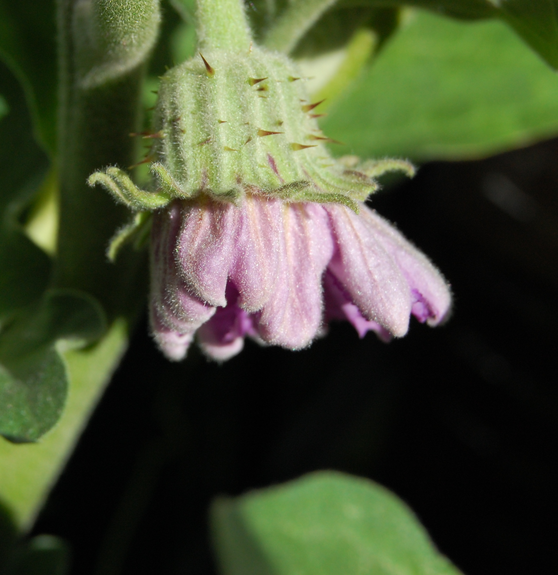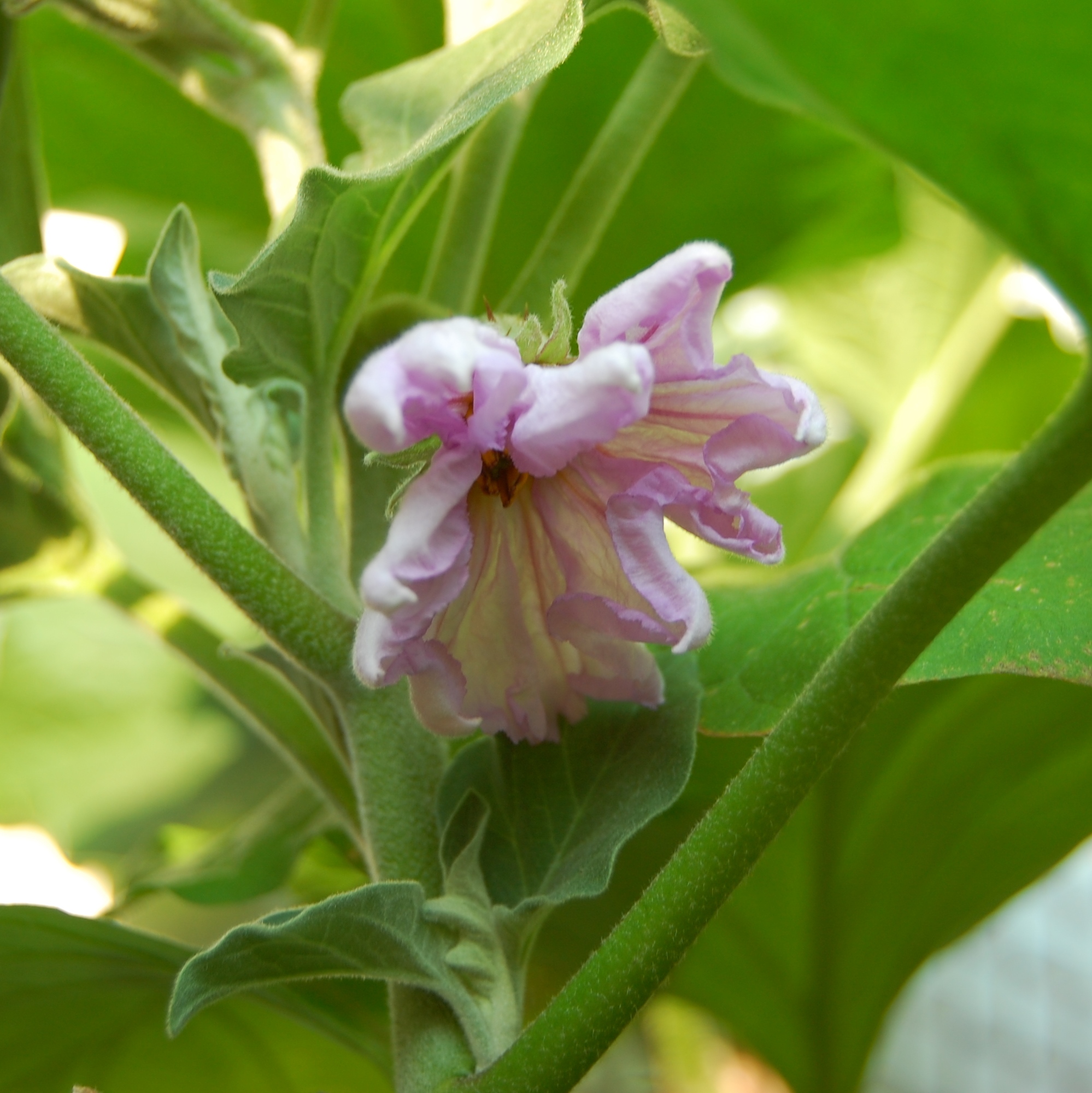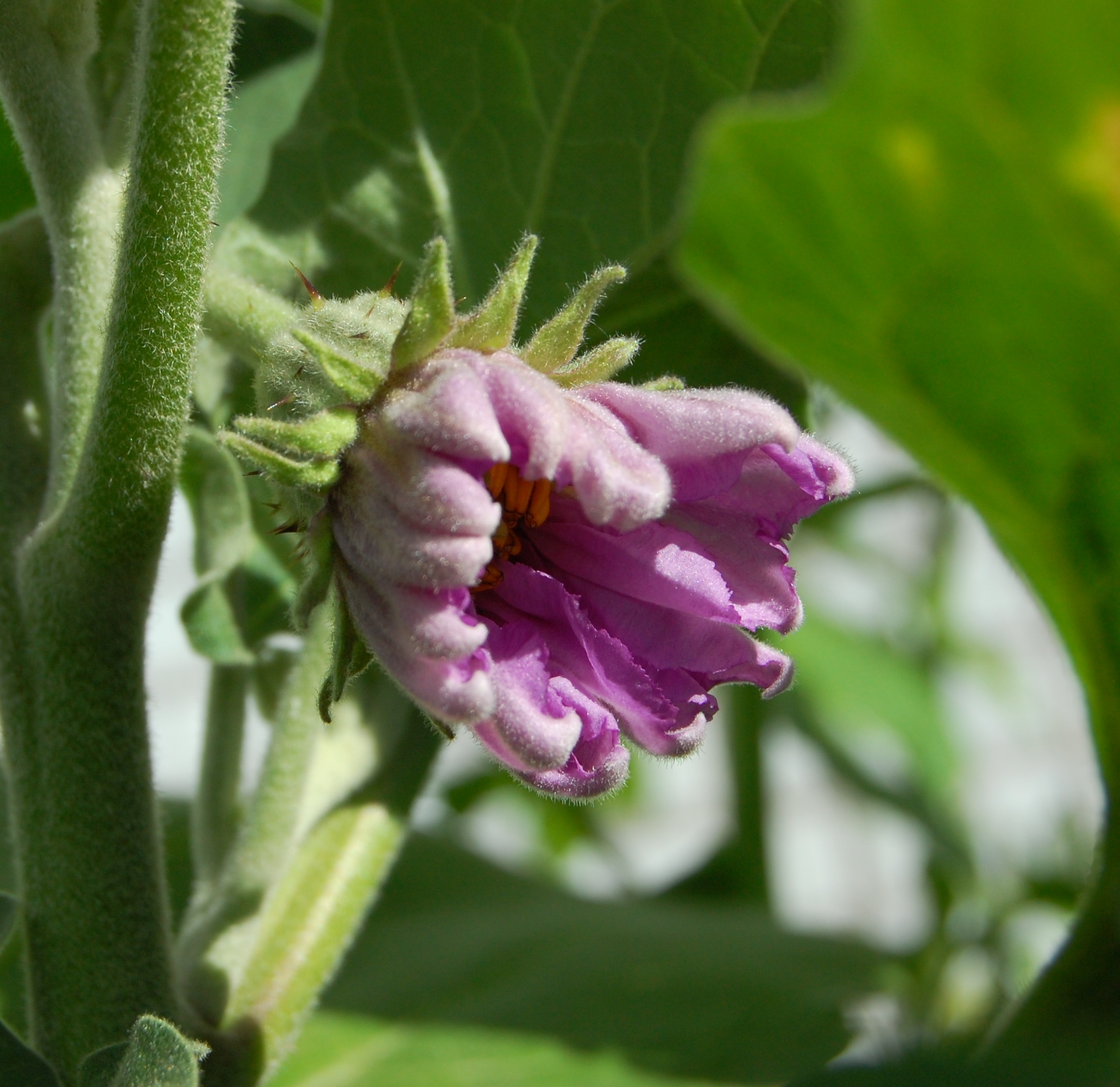 Nezinu, vai neaizkaltēšu vai kā citādi nenozūmēšu manus trīs baklažāna stādus, tāpēc steidzu stāstīt un rādīt, ka ziedi vien ir ārkārtīgi interesanti. No necila velnābolam līdzīga pumpura izaug skaists violets zieds ar dzeltenu vidu, kas ziedēšanas sākumā ir tumšs un arvien izbalē. Zieds ir diezgan biezs, ciets, aptuveni 5 cm diametrā un mazliet attāli atgādina milzīgu kartupeļa ziedu.
